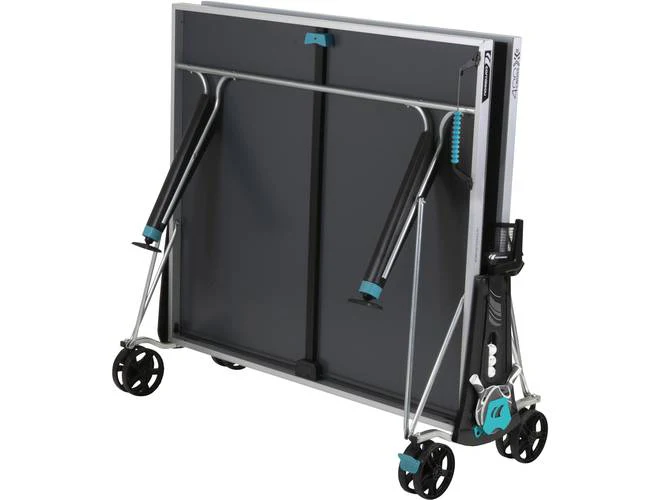 The Cornilleau 400X Outdoor Ping Pong table offers a solid core 5mm-thick resin laminate playing surface designed to take on heavy rain and snow, extreme heat and major paddle impacts. The SOFTMAT finish applied to the 400X ping pong table reduces the intensity of the sun’s rays threefold compared with an uncoated table. All the metal parts used are selected for their resistance and receive an anti-corrosion coating. The 400X also sports two point counters, two brakes, oversized double wheels, paddle and ball storage, tension net and the COMPACT TECHNOLOGY® folding system that has the dual advantage of being less bulky than a standard table and easier to handle.