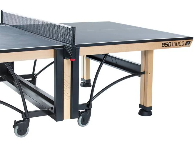 The Cornilleau 850 Wood table tennis table is an absolute stunner. above Above the esthetic value, the 850 Wood provides the ping pong table with unequaled sound and playing qualities. This is a contemporary design, using a grey indoor top and retractable net posts. These two ITTF approved innovations are completely new in the world of professional table tennis competition. The 850 Wood, brings performance and elegance to the world of ping pong that will become a standard for international competitions as well as a perfect match for your interior design. The patented "Compact Technology®" system ensures optimum safety, easy movement and minimizes storage space requirements.