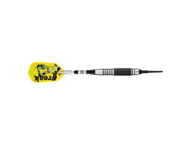 The Freak Soft Tip dart set features the Spinster aluminum shafts that let the dart spin out of the way of incoming darts for tighter groupings and higher scores. The barrels are Nickel Silver with various knurled grips and alternating black coatings.These are available in 16 or 18 gram weights and inlude a dart tool.