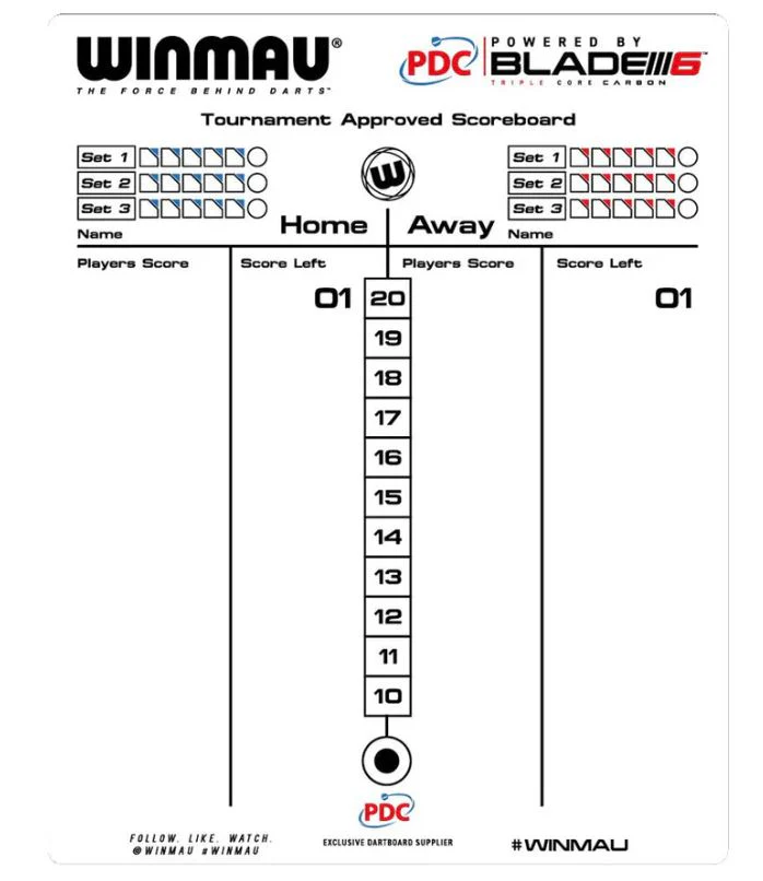 The Winmau Dry Wipe Scoreboard is the perfect tool for home play. This double-sided scoreboard features both a chalkboard and whiteboard and comes with two dry wipe pens. It also includes the 5 leg official match scoring system and the cricket scoring system for a complete experience. The scoreboard measures 18 inches by14 inches, making it the ideal size for any game room.